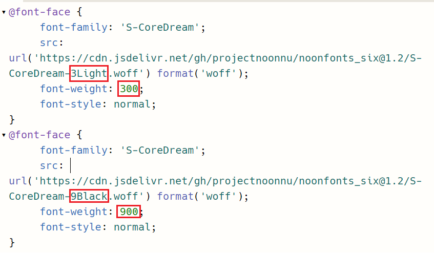 - url에서 두께를 수정하였다면, 사용자가 헷갈리지 않게 각 두께 숫자만큼 @font-face의 font-weight도 수치화하여 수정하는 것이 편하다.