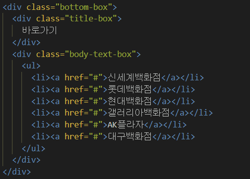 - title-box에는 바로 각 메뉴의 제목 텍스트를 적어주고, body-text-box에는 소메뉴를 나눠주는 ul, li태그를 추가하고 각 li태그는 다른 곳으로 링크되는 역할을 가지고 있기 때문에 자식 엘리먼트로 a태그를 추가한다.