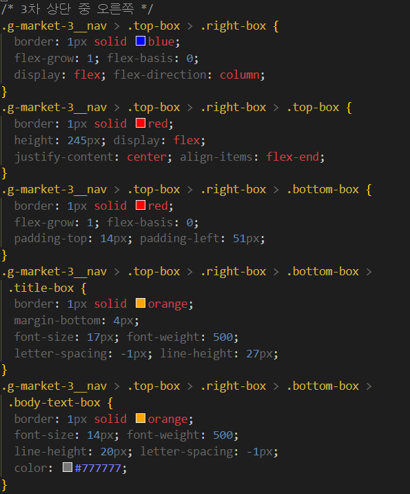 - top-box와 bottom-box는 서로 한 줄에 하나씩 배치되지만 높이에 대한 유연성을 보이기 위해 상위 엘리먼트인 right-box에 display: flex와 flex-direction: column을 추가 작성한다.