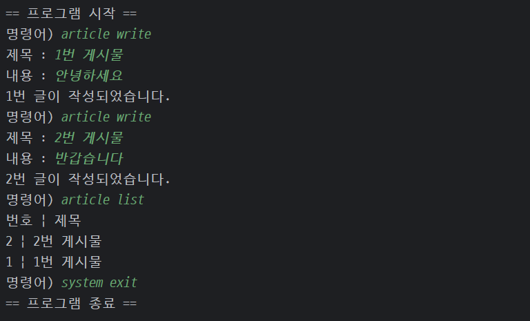 - 게시물을 작성하고 나서 해당 정보들을 리스트에 저장하는 순서이기 때문에 'article write' 명령어가 이루어지는 곳에 새로운 article 객체를 만들어준다. 이 때, 생성자 매개변수에 맞게 인자를 작성해주면 된다. [Article article = new article(id, title, body)]