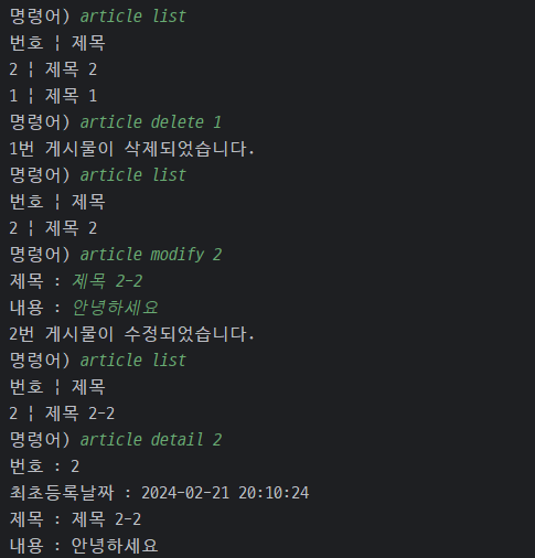 - 게시물의 삭제 기능을 구현했다면 이번에는 "article modify 고유번호" 명령어를 통해 원하는 고유 번호의 게시물을 수정할 수 있도록 만들어보자.