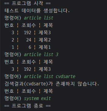 - 다음은 "article list" 명령어 뒤에 문자나 숫자를 입력해서 해당 문구가 포함하는 게시물의 제목이 있다면 해당 게시물만 리스팅하여 보여주는 검색 기능을 추가해봅시다.